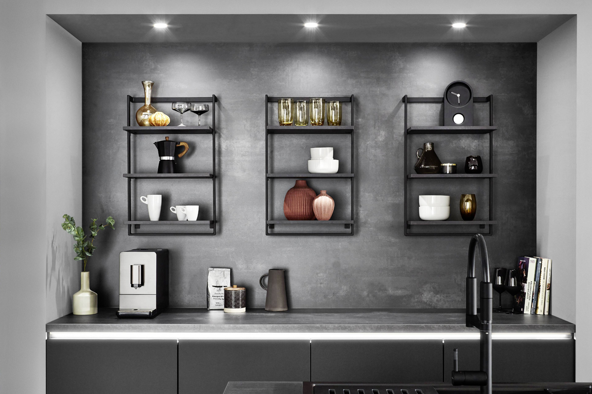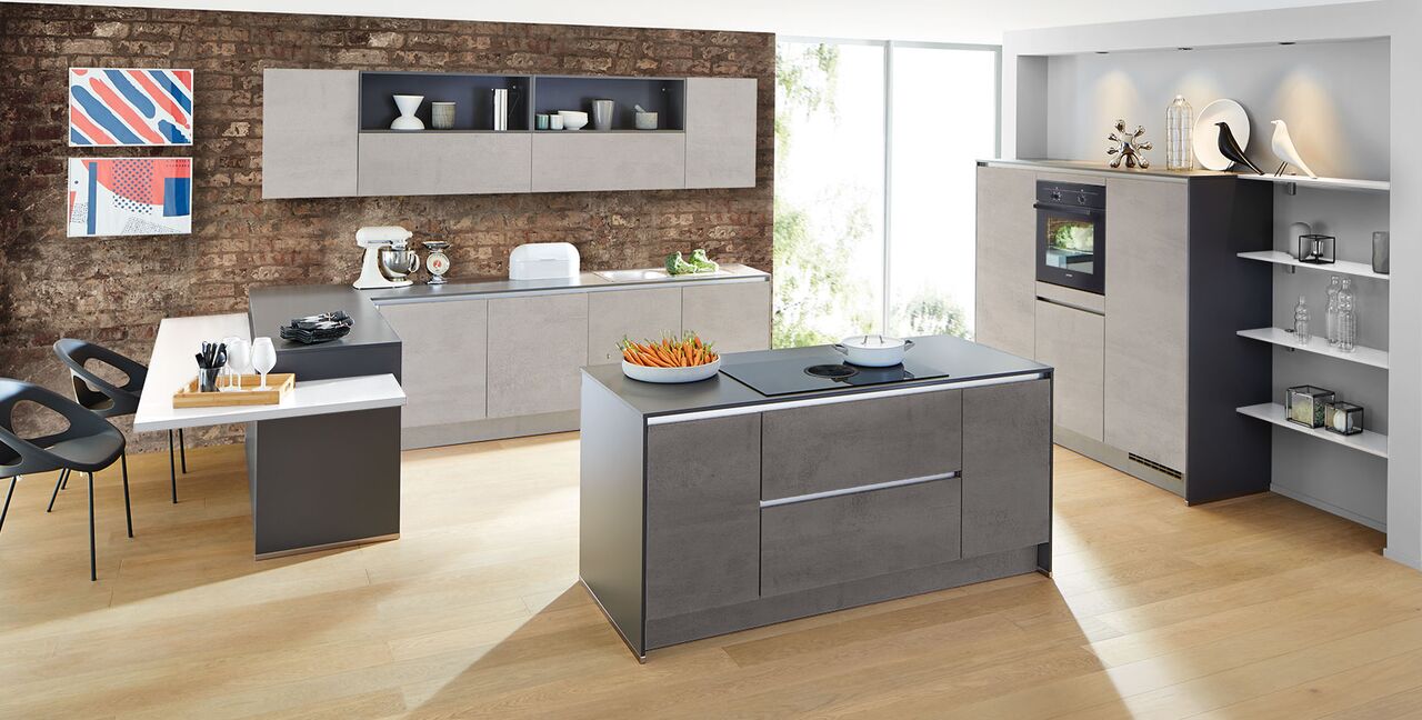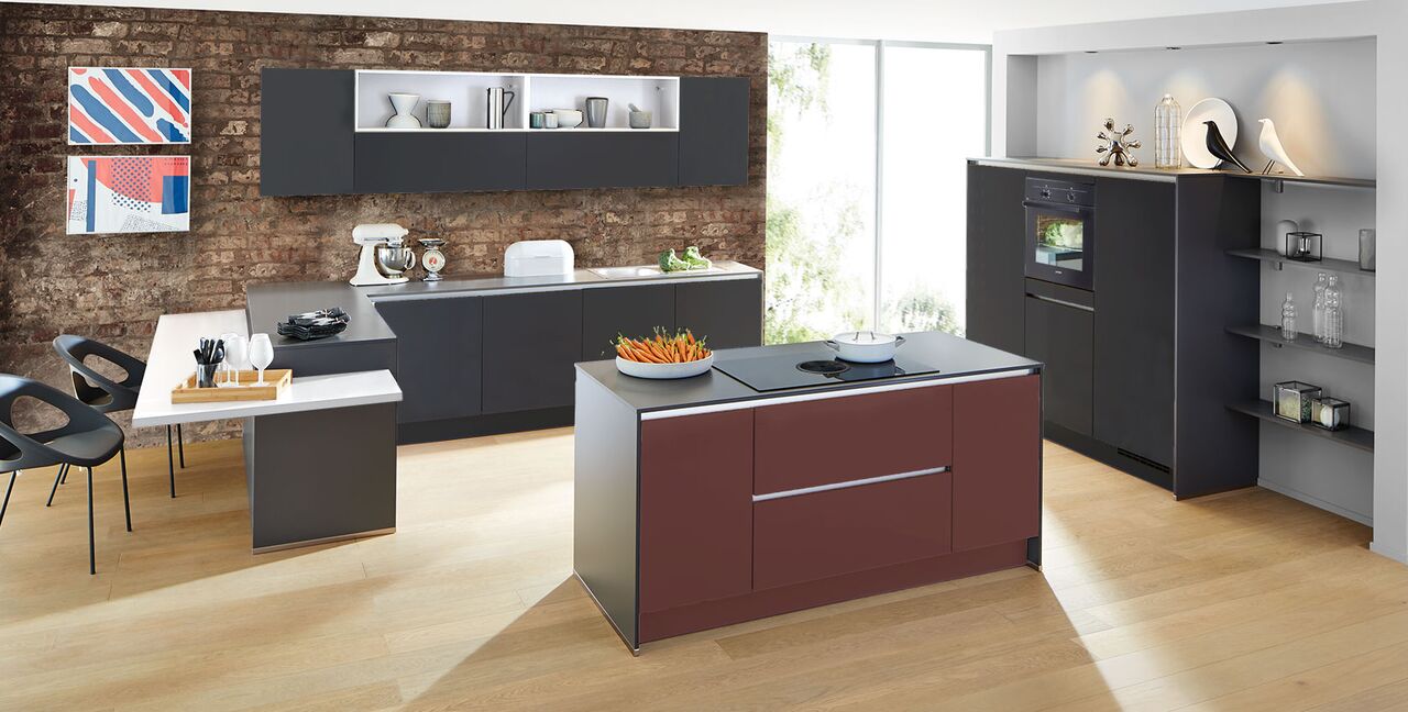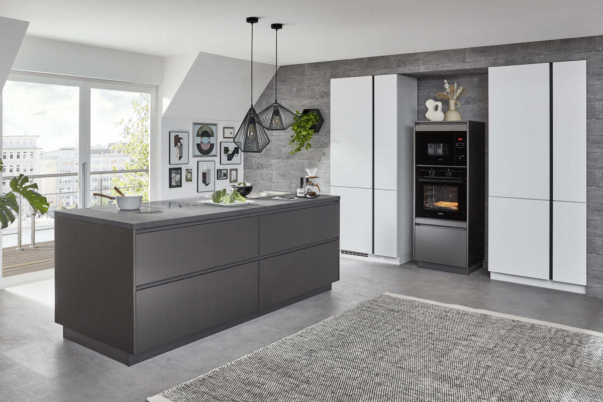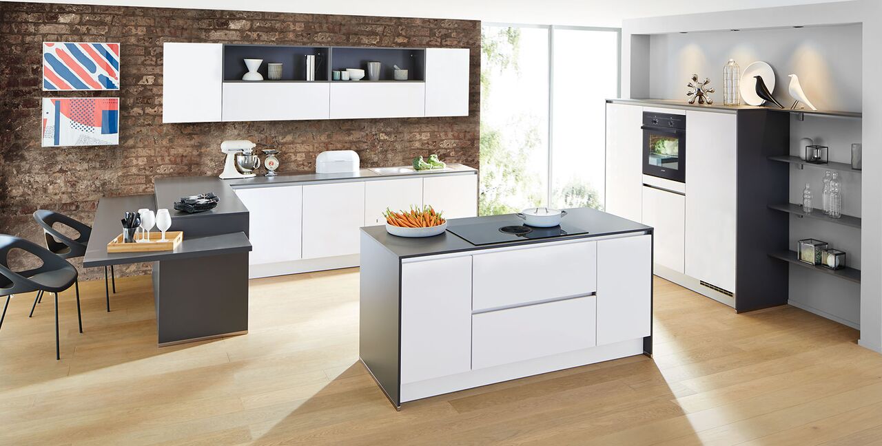 Inklusive Einbaubackofen schwarz Bosch HBA510BA3 Energieeffizienzklasse A, Glaskeramik Kochfeld mit Induktion und Kochfeldabzug (Umluft) Bora GP4U, Kühlschrank Laurus LKG88E Energieeffizienzklasse E, Einbauspüle Edelstahl Rodi Okio Line 85 Deep, Unterschrank mit Großraumauszügen, Wandschrankregalen, Wandschränken mit Klappe, Essplatz.