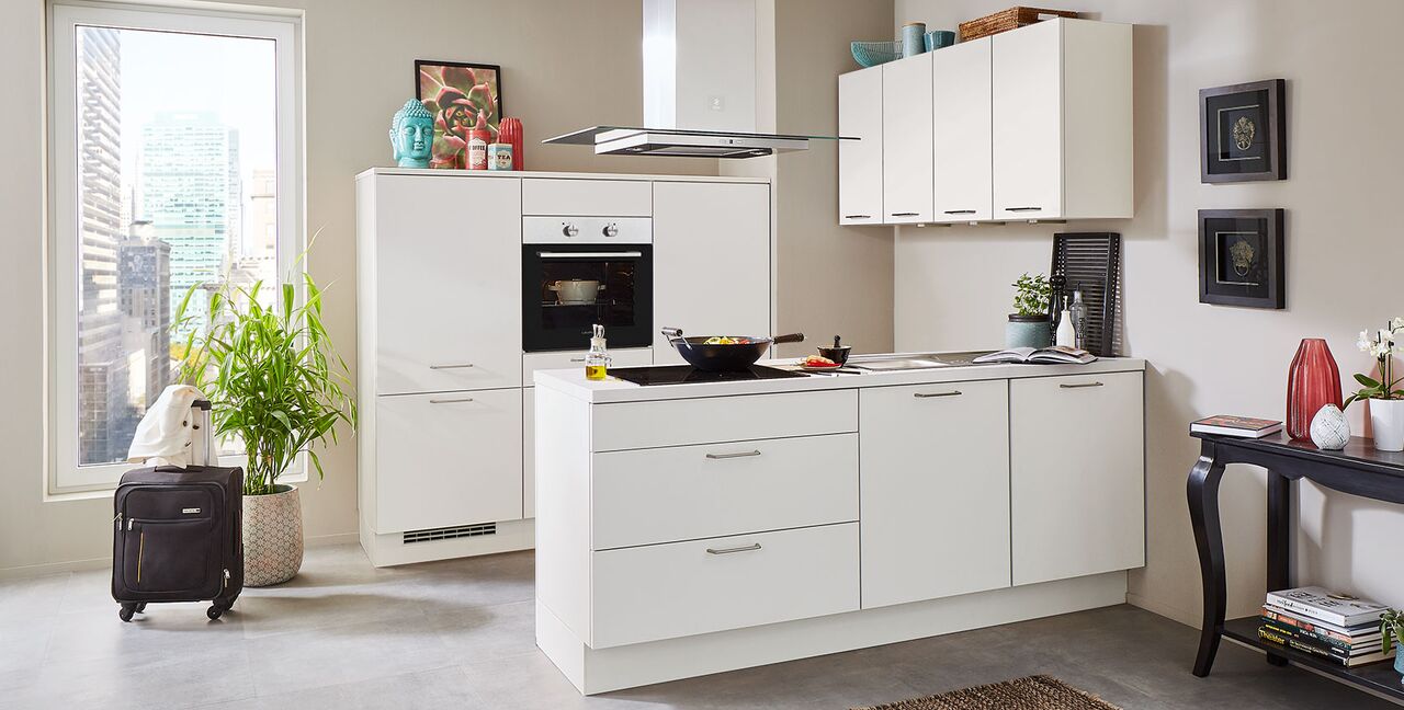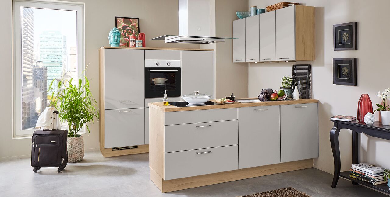 Inklusive Einbaubackofen Edelstahl Laurus LEB3 Energieeffizienzklasse A, Glaskeramik Kochfeld Laurus LCA600, Inselesse Edelstahl Elica JOYE INSEL-A Energieeffizienzklasse A, Kühlschrank Laurus LKG88E Energieeffizienzklasse E, Einbauspüle Edelstahl Rodi Okio Line 85 Deep, Unterschrank mit Frontauszügen.