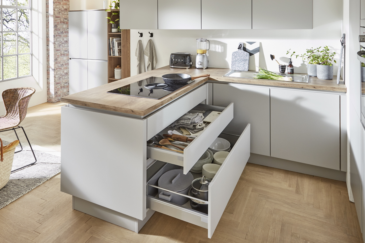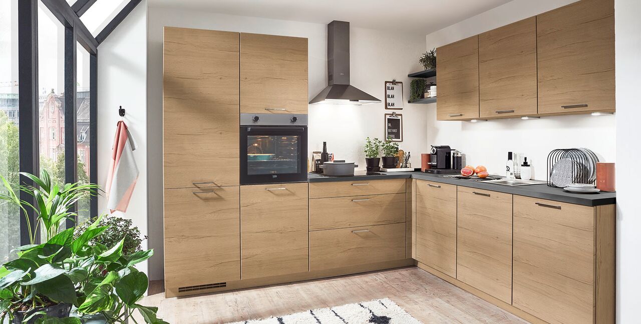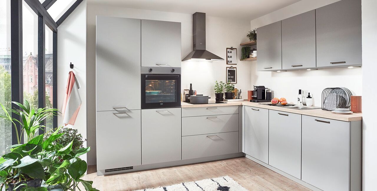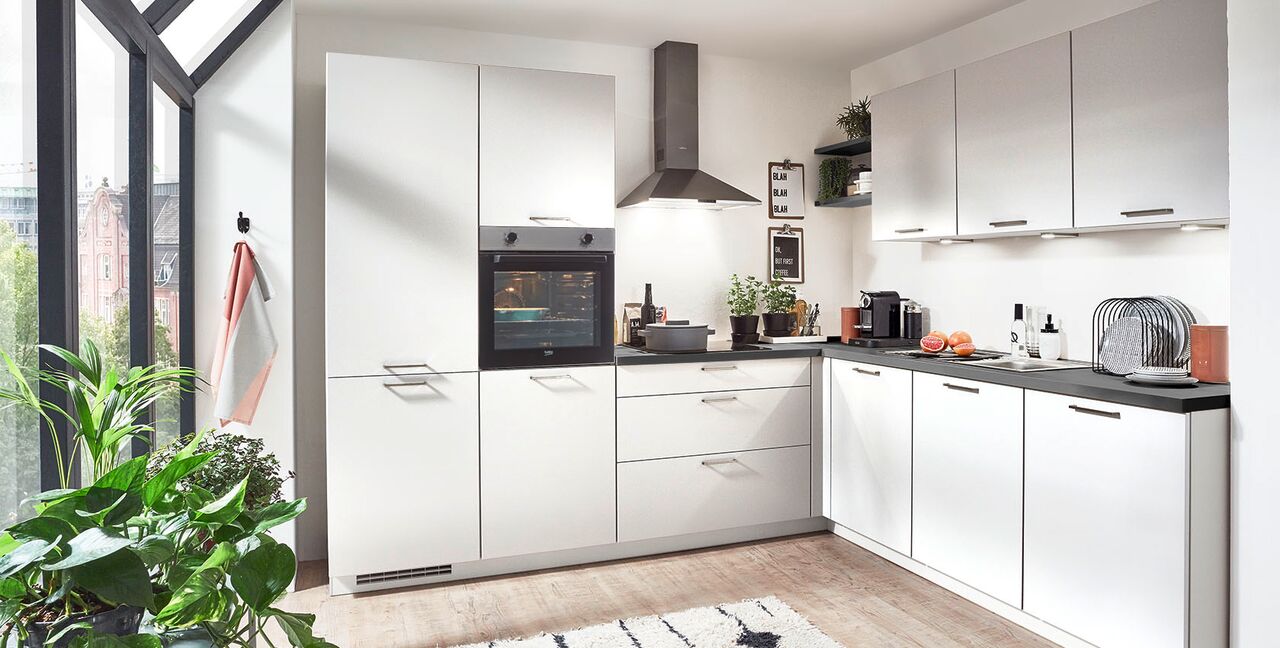 Inklusive Einbaubackofen Edelstahl Beko BBIE110N0X Energieeffizienzklasse A, Glaskeramik Kochfeld Beko EB9741XHL, Dunstesse Edelstahl Elica MISSY DT 60-D Energieeffizienzklasse D, Kühlschrank Beko BSSA210K4SN Energieeffizienzklasse E, Einbauspüle Edelstahl Rodi Okio Line 85 Deep, XL-Schränken, Unterschrank mit Frontauszügen, Wandborden.