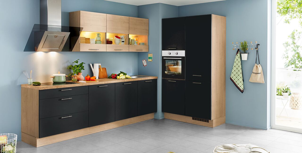 Inklusive Einbaubackofen Edelstahl Laurus LEB3 Energieeffizienzklasse A, Glaskeramik Kochfeld Laurus LCA600, Designesse Edelstahl / Schwarzglas Airforce F134-90 S4 BK Energieeffizienzklasse C, Kühlschrank Laurus LKG88E Energieeffizienzklasse E, Einbauspüle Edelstahl Rodi Okio Line 85 Deep, Unterschrank mit Frontauszügen, Wandschränken mit Segmentglastür.
